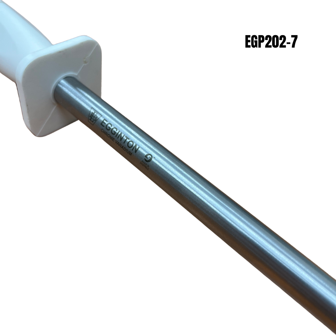 This Steel is fitted with a sterilisable, non-absorbent polypropylene handle with a 1.5" square guard and stainless steel hanging ring.