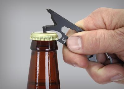 Black Stainless construction. Tools include Carabiner l Hex/Bit driver l Phillips screwdriver l Belt/cord cutter l Bottle opener l Small screwdriver l Pry bar l Ruler. Carbide knife sharpener.